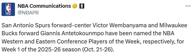 北京時(shí)間10月28日,NBA官方公布了新賽季首周的周最佳球員,馬刺隊(duì)中鋒文班亞馬當(dāng)選西部周最佳球員,雄鹿隊(duì)前鋒字母哥則斬獲東部周最佳球員榮譽(yù)。這是文班亞馬職業(yè)生涯第二次當(dāng)選周最佳球員,對(duì)于字母哥而言,這是他生涯第28次當(dāng)選周最佳。首周的周最佳競(jìng)爭(zhēng)激烈 ,東契奇和亞歷山大場(chǎng)均40+的表現(xiàn),仍無(wú)緣當(dāng)選。
